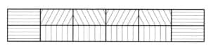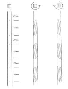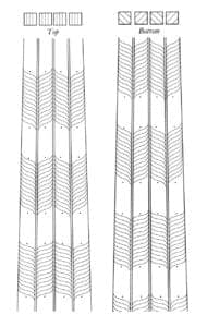To begin the sword, 10 billets of the same proportion as the last sample were made. (See Figure 1). These were forge-welded and drawn out into slightly tapered square rods, 500mm long, 10mm at the big end and 6mm at the small end. It was critical to avoid forging a parallelogram that would skew the layers and ruin the pattern. The rods were then center-punched at the intervals shown in Figure 2. They were then divided into two groups, one group was twisted clockwise and the other counter-clockwise. The eight best rods were selected and joined as illustrated in Figure 3. The tapered rods produced a tapered core bundle. This was important because the pattern would become uneven and distorted, especially near the tip, if the sword's taper was forged later. This bundle was arc-welded together at the ends and a handle was added. It was then slowly heated in a large coal fire, fluxed with borax and returned to the fire. When an even welding heat was drawn, the rods were hammered together and fused.