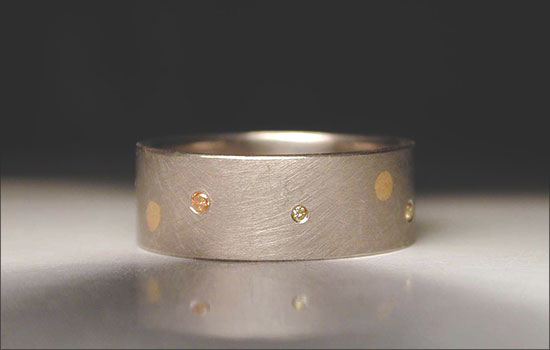 Custom designer Jim Dailing of Bend, Oregon, has been making jewelry for 30 years. For a brief stint during the mid 1980s he did so in a traditional jewelry store that he helped to open. But he soon found that he was not a fan of all the distractions that come with a retail environment, preferring instead to concentrate on the design process and the clients involved in a more intimate setting. His main studio in Portland, Oregon, while mostly workshop space, has a comfortable meeting area for appointments. (He also has a studio in his hometown of Bend, splitting his time between the two spaces.) Although he did not set out to specialize in wedding rings, his business evolved in that direction. For Dailing, the stories his customers share about their relationships motivate his art. During initial client meetings, which usually run from 30 to 60 minutes, talk of jewelry may not surface for quite a while..