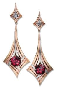 Look back over the list of past Vision Award Laser Distinction winners and you'll see that Adam Neeley's name appears quite often. The Laguna Beach, California-based designer is always looking to challenge his aesthetic by envisioning complex pieces that can only be realized through laser welding. Case in point: his stunning Rouge Moderne earrings, a lattice of satin-finished 14k white, rose, and yellow gold bars and fiery red zircons floating over a high-polished backing, all topped with kite-shaped diamonds.
