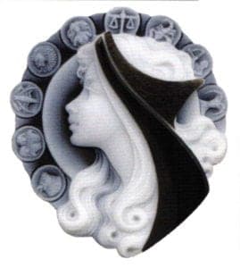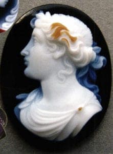 Agate cameos are made from dyed multiple layered agates, which are a regional specialty of the cutters around Idar-Oberstein in Germany. Agate was first used for carvings during the Greek and Roman Empire and ever since, people have admired the detail and dimension of carved layer-stones. In the early 1980's, cameos have become more affordable due to the use of ultra-sonic carving machines.