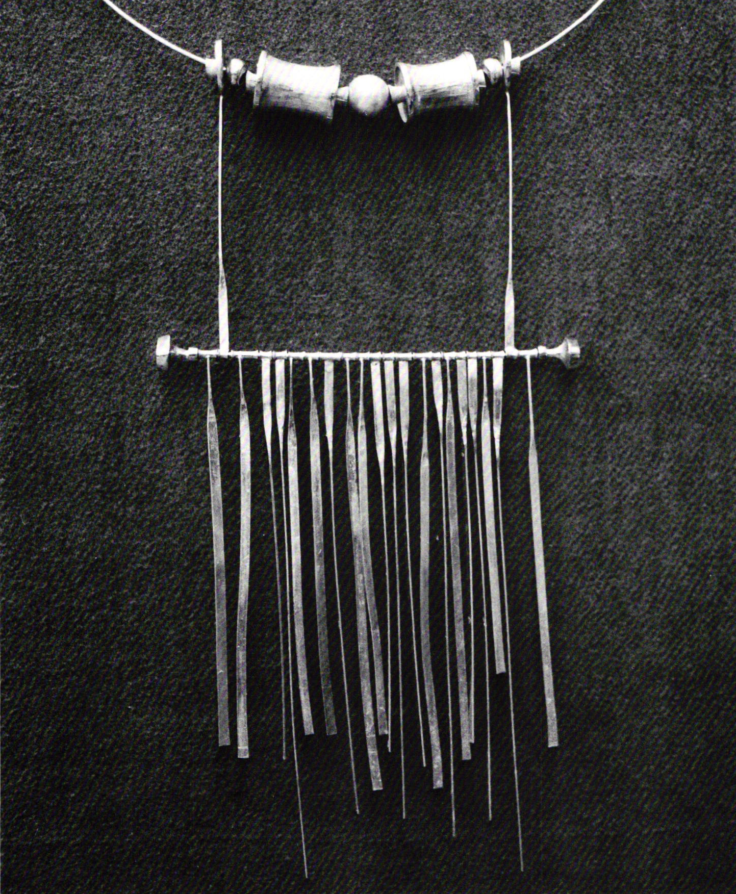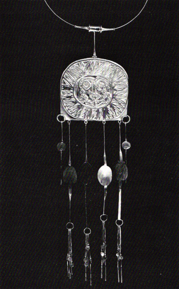 The brief summary of Al Pine's career is meant as background for an understanding of how his work came to be in step with the California crafts movement. The period when Pine did most of his jewelry was soon after he arrived in California, from the mid-60s to mid-70s. Much of the work is gold or silver, forged or cast, the directness of technique clearly apparent in the final piece. However, a complex imagery operates within the pieces, which is abstract yet somehow familiar, associative. This quality causes the work to feel amuletic, a personalized language of symbols that seem to have intrinsic power. Many of the pendants hang in elongated diagrams from simple neckwires. They have an airy, mobile, changeable quality, and appear light and free. Some of the elements appear to be found objects — keys or emblems, ankhs or beads — but they are part of Pine's vocabulary made from a rich, imaginative experience of the history of jewelry and ethnic artifacts. The primitive feeling allies many of the cast sterling brooches with modern sculpture.