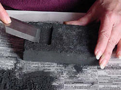 To make an ingot mold, use a compressed charcoal block. It is much harder than a standard charcoal block. It is much harder and will hold up better under high heat when making sheet ingots. Use a sharp 1 ½" chisel, scrape the charcoal down in thin, even layers. (Fig. 5) The bottom should be flat and smooth. Make the area approximately 1/8″ deep and 2″ long. A thin, wide, flat ingot is preferred. A thick ingot is harder to work down to make sheet.