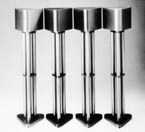 In addition to the infinite color palette, another reason that aluminum anodizing has become popular, is the ease in which two-dimensional elements can be incorporated into the anodizing process. Resists can be used in several different ways to achieve these two-dimensional effects. One technique is to apply resists before the aluminum is anodized. This prevents the porous oxide coat from forming under the masked areas, impeding dye penetration and leaving the natural color of the aluminum in those areas. Resists can be used to mask areas for etchng or sandblasting. When the masking is removed, anodization produces textural and color differences with a single dye. Both of these methods require a rather "tough" resist to withstand the harsh action of etching, sandblasting and anodizing. There are many suitable resists such as 3-M lead tape, Advance K94s silkscreen resist and asphaltum.