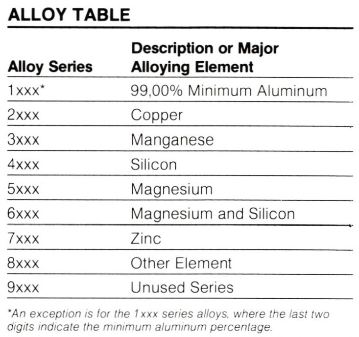 There are many different alloys of aluminum each having different properties. These alloys are classified according to a four digit identification system. The first digit for wrought alloys denotes the alloy-by-alloy series or principle alloying element. The second digit, if different from O, denotes a modification in the basic alloy. The third and fourth digits form an arbitrary number that identifies the specific alloy in the series. (See Table).