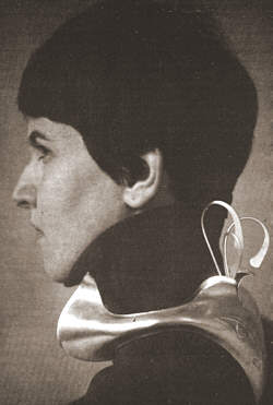 The pieces produced in aluminum were purposefully designed to do what no weightier metal could do. An ornament worn just below the knee cap would fall down to the ankle upon the first step if it had been made in another metal. The choker which envelopes the neck and part of the back would be unbearable to carry if aluminum had not been used. The neckpiece rests on only two parts of the body, yet remains stationary and completely in tune to the body's movements.
