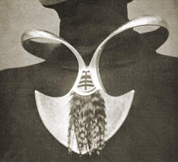 | Marcia Lewis, Stethascope Neckpiece 6061 Series Aluminum, ivory, ebony feathers, welded and engraved, 1/2″x 8″x9″ |