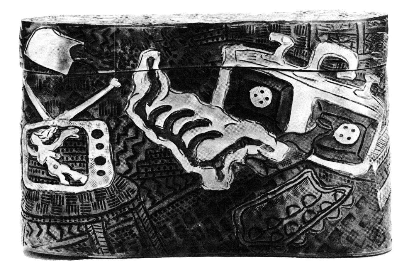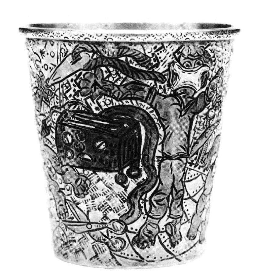 And it's here that we return to the issue of function, for Norrell prefers that her works be usable. She has used her cow and goose spoons, and there is no reason that the boxes and flasks would not function. She is more comfortable with the offhandedness, the low regard that people give to functional objects. The functional form of the pieces, the fact that they are curving flasks and cylindrical cups, also amplifies the spatial confusion of her work. There is no starting place, little sense of front or back, just a spatial and contextual continuum that one must push into and try to make sense of—just like life. Metal techniques also make a specific contribution to the character of her work. The process of forming distorts and individualizes the already loosely structured scenes and deforms the images further. That's fine with Norrell. She likes the paradox of precise metals techniques resulting in a primitive, chaotic image.