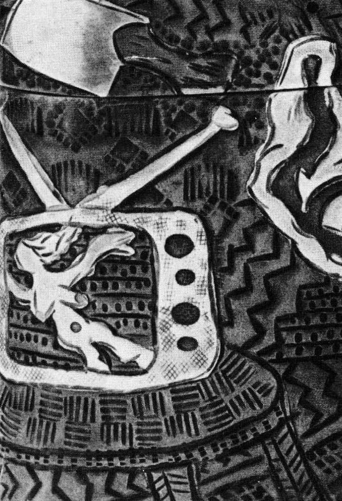 The Meat Box is a transition into the eating and drinking theme. The cows appear again, but this time they have been processed into sides of beef, with ghostly ribcage patterns, and they float through a kitchen along with a plucked fryer, an open carton of eggs and a rabbit-eared television set. The Dining Table Bot seems to lead into new territory. The subject table has splayed legs and a potato-shaped top. On the reverse of the box, floating upside down, are two large nude figures engaged in animated conversation. They bob above an armchair; a fish swims beside them, a duck walks on the floor below them. What does it mean?