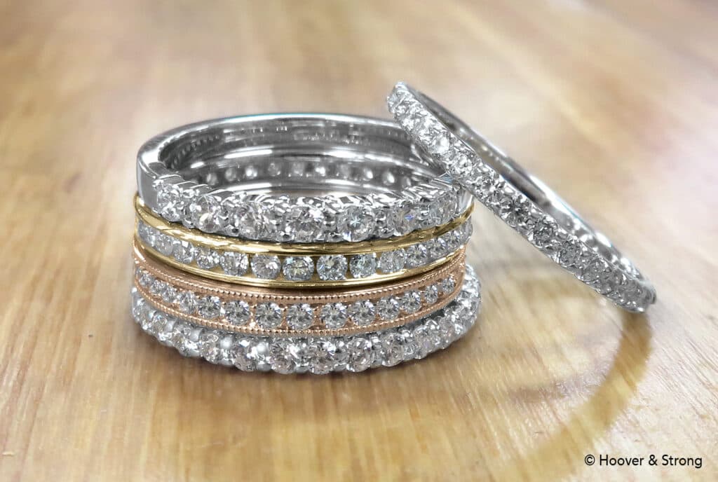 We first started working with diamonds only recently in about the last fifteen years and it was a natural, customer-driven evolution. We were offering anniversary bands and were asked to sell them finished with the diamonds set. So again, we started with just a few customers. As the demand increased, we hired a diamond manager and developed the department organically. We accomplished this by doing three or four acquisitions.