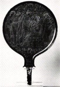 Of all the individual objects found in the Etruscan tombs, the bronze hand mirrors may tell us the most about the culture. The mirrors were engraved with illustrations of Greek myths or scenes of daily life. The engraved characters were labeled with names or identified by costume and symbolic attributes, giving scholars one of the first clues to the Etruscan language and lifestyle.
