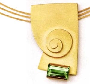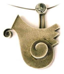 This old item of jewelry made of silver with moss agate (suspended on an old cello string!) is one of Aninka Harm's first pieces. In this case also, the volute is in the focus of the designs