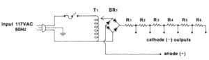 This simple rectifier and current limiter with six outputs can be built from readily available parts for well under $50. Parts can be obtained from a local electronics supply house or even your neighborhood TV repair shop.