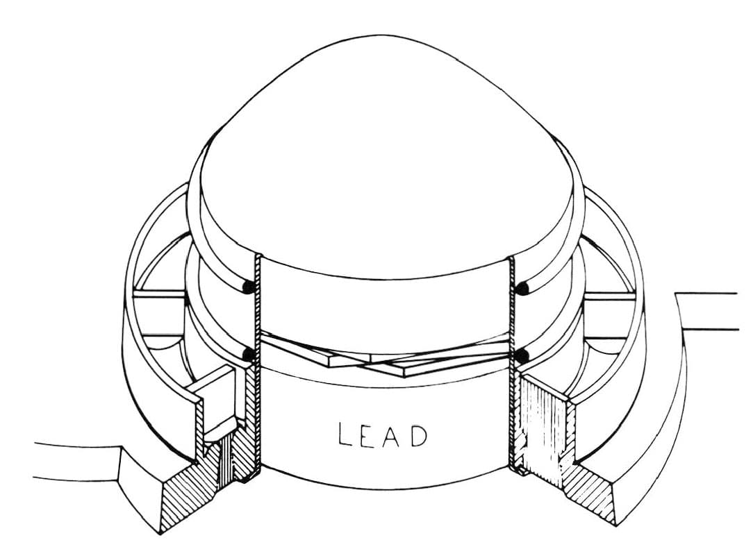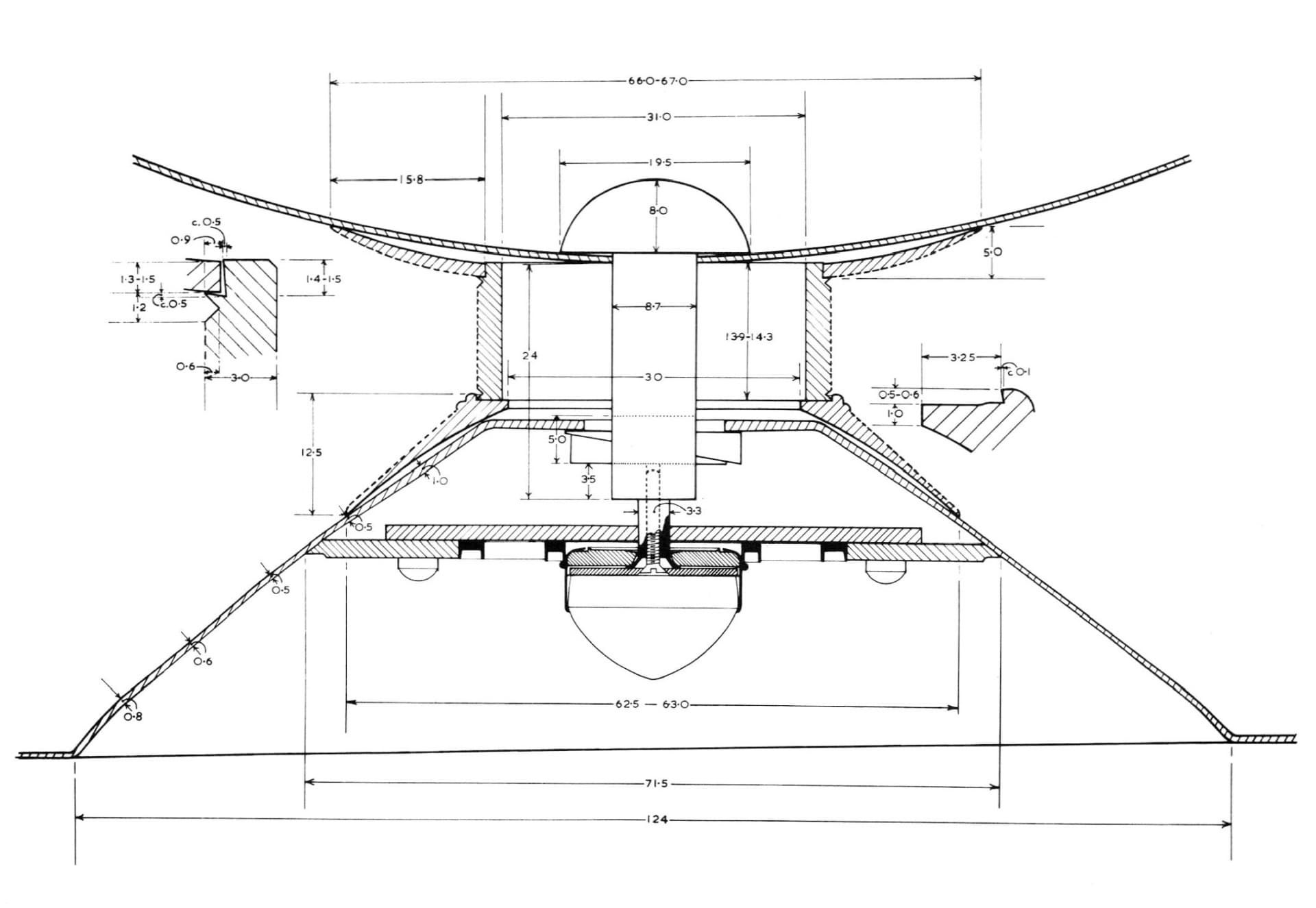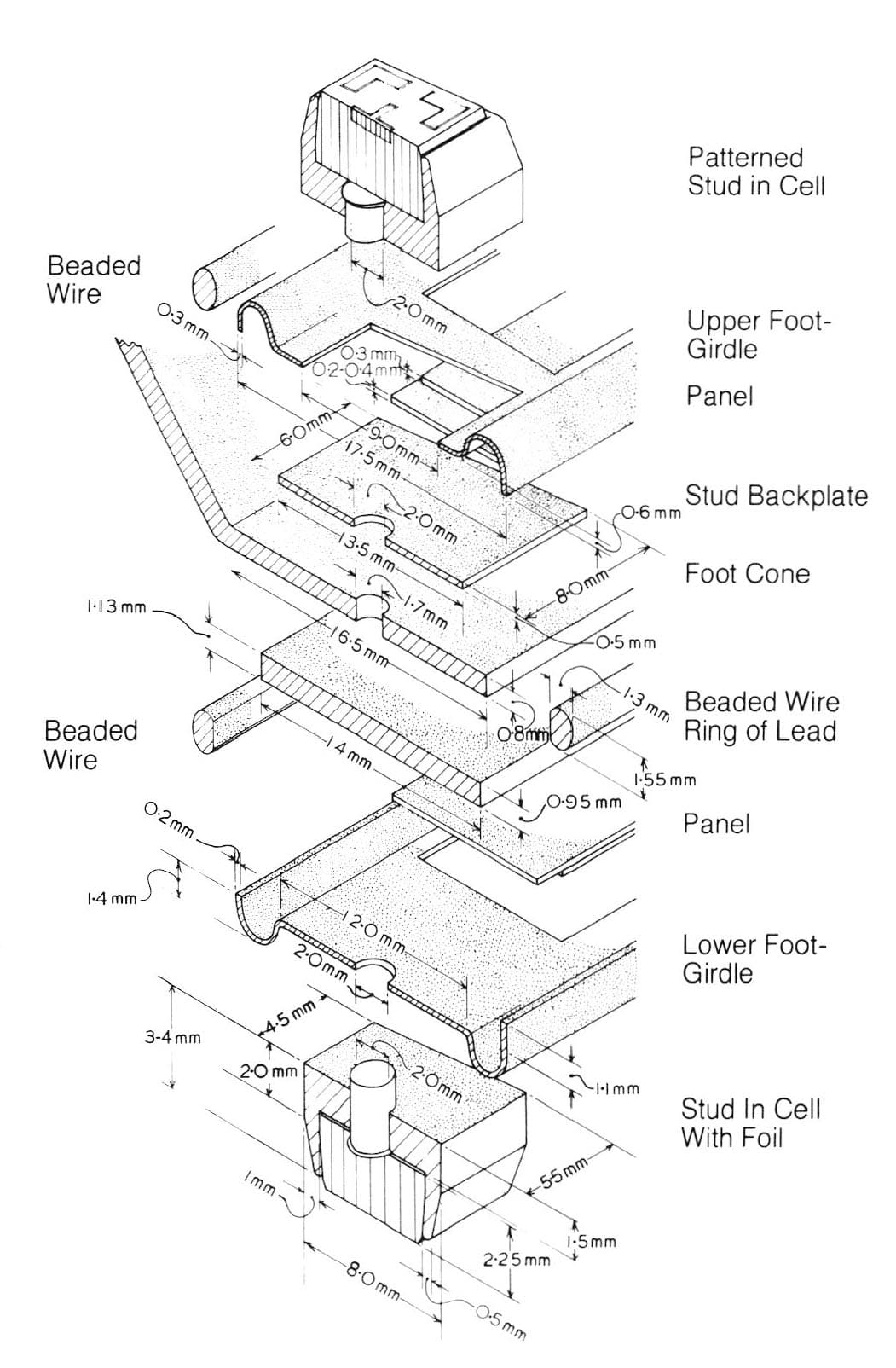 The next stage of examination was to touch the underfoot disc, the component decorated with the five small circular studs, and to attempt to rotate it gently. The disc could rotate only through a small angle. From this it was deduced that the disc was mounted loosely upon a square bolt, or at least upon a bolt whose end was not circular in cross section. The parts were next separated; first, the crystal was eased from its mount. Then the whole of the mount was lifted away from the under-foot disc. This then revealed inside the foot-cone the expected square bolt. It also revealed two sharp tags projecting from the end of the bolt. The earlier deductions now stood confirmed: here were the sharp projections that had torn the silver foil and also the square bolt.