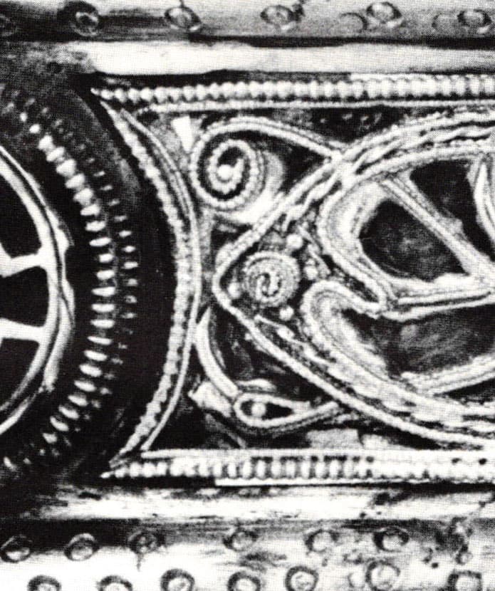In the upper length of a short portion of the girdle there is, to the right of the left-hand stud, a length of inserted silver that is very much whiter than neighboring metal. When seen from the back it is clear that two pieces have been soldered into place with hard solder. The panels that were set in the long apertures in the girdle, consisted of three types: zoomorphic, ornithomorphic and knot-work. The zoomorphic panel shown in figure 5 was made up in three layers, first the lines of the design ridged up in gold in the pressblech manner with the intervening background cut away; second, lying along the top of the ridges, soldered on, was a treble layer of beaded wires, only the top row being visible in the photograph at first sight but all three being clearly present on close examination; third, backing the openwork pattern was a plate of gilt copper, taken away for the purpose of making this photograph. Around the panel, beyond the bordering beaded wire, was left a narrow flange that would have prevented the panel from falling through the containing aperture in the original design.