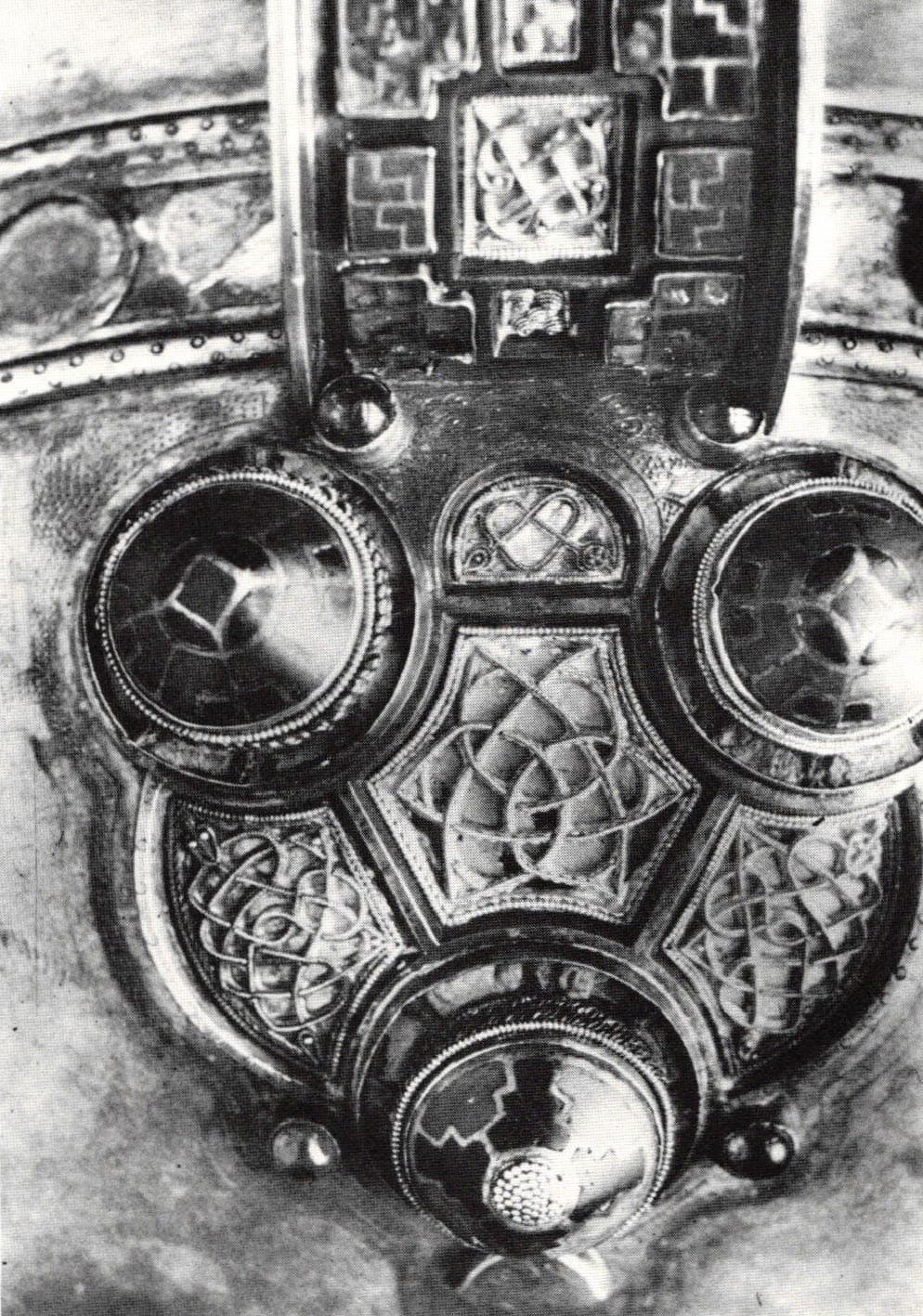 Let us turn to the drawing, figure 2, examining now the under-foot mounting in which the central crystal was set. Although this mounting was decorative it served to hide the central fixing device and also served a structural purpose: it centralized the bolt on the axis of the foot-cone and made the whole structure rigid. The mount for the crystal itself is held against the back plate by means of the so-called catch disc (figure 3). Looking outward along any radius of the mounting, a number of features can be observed. First there is a gilt silver channel which contained fragments of malachite and amber. Outside the channel lies a circle of gold filigree interlace, zoomorphic in style. Outside this again lies another channel, silver-gilt, now empty. Beyond this is a double feature: a gilt bronze circle that contains five studs and an outer circle of gilt bronze interlace. The various circles can also be seen in figure 3.