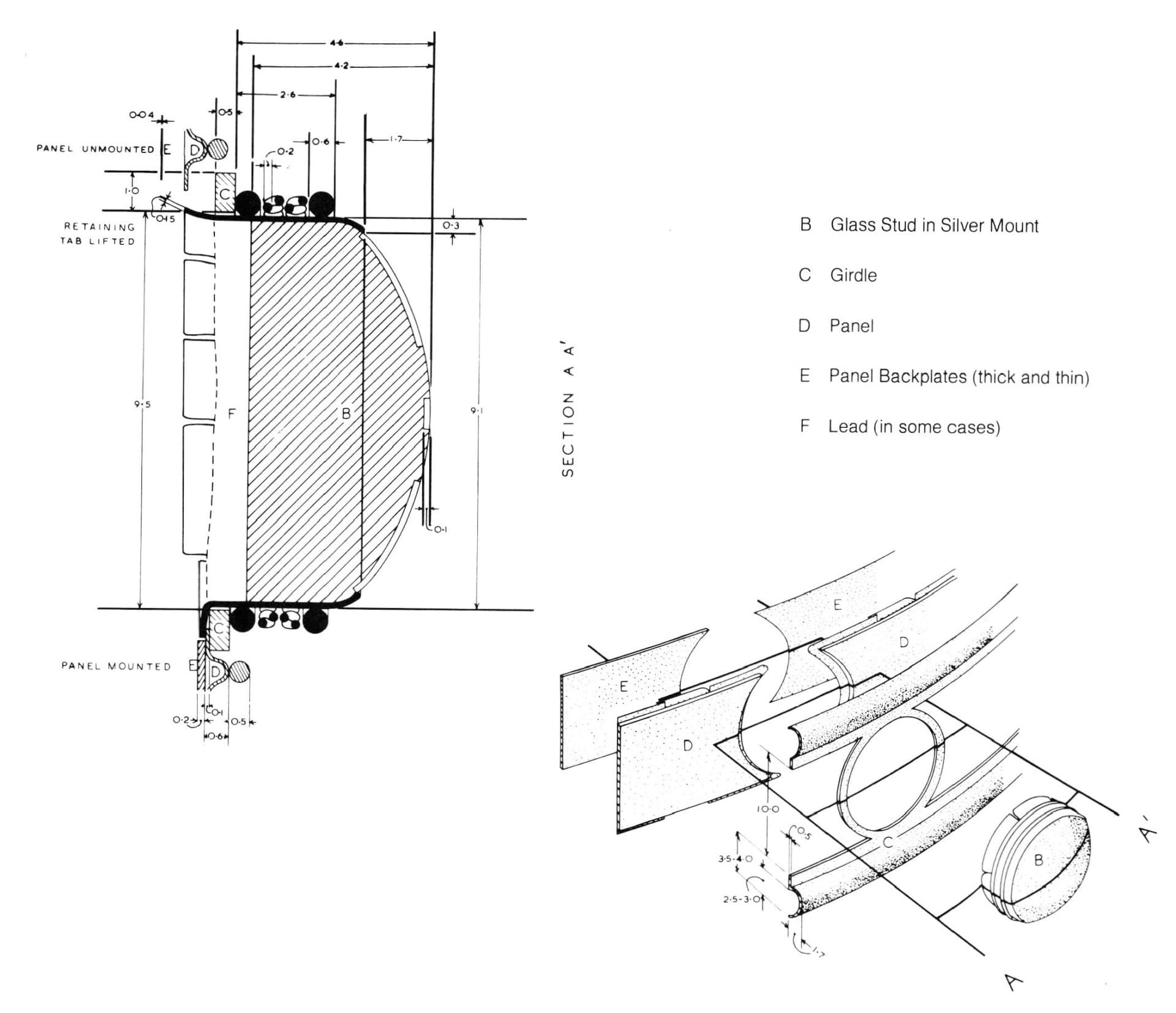 In figure 7 all of the physical data concerning the silver grille and the glass backing of a stud in the bowl girdle have been incorporated in a single dimensioned drawing. It shows a cross section through the stud accompanied by an exploded drawing that indicated how the panels and panel back plates were assembled in the bowl girdle. The mounted stud B was passed from the front into the hole in the girdle C. A lead plug F in the cross-sectional drawing was pushed into the back of the mount and was expanded by a series of punchings around its periphery. The adjacent panels with back plates D and E were dropped into place in the apertures in the girdle and the slit edges of the stud mount were turned over to hold them in position. The drawing shows the condition of the girdle as received. It would have been more in accordance with the concept of the design if the edge of the back plate E, cut back by someone—possibly Johnson—had been left equal in length with the panel D and the two components had then been held together by the turned-over edge of the stud mount.