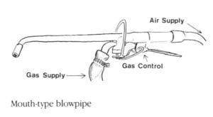 In 1980 I returned to Canada and established my own workshop. I began to experiment with fused metals to obtain the color of 24-karat gold and the strength of sterling at a reasonable cost. The first problem I encountered was the selection of a suitable torch. My first experiments indicated that acetylene was too hot and propane/air was too oxidizing. Eventually I settled on a mouth-type blowpipe and propane gas. This provided excellent control, and by combining this torch with a charcoal soldering block, a reducing atmosphere could be maintained. The blowpipe I use costs about $15.00 and is available from several European tool companies (see Suppliers). I sawed off the tip from a Bernz-O-Matic-type, small propane torch kit and clamped a rubber hose to the brass tube that was left to supply the blowpipe with gas. The air is blown into a second tube. The most difficult part of using a blowpipe is that the flow of air must never stop. This means that, like a horn player, one must breathe in while a reservoir of air held in the cheek supplies the torch. This is replenished as one breathes in and so the flame is never interrupted. Facility with this is best accomplished by practicing with one of the old-fashioned smaller blowpipes used with an alcohol lamp. The amount of heat produced is directly related to the air supply so the process is very direct and controlled. It can be done slowly enough to ensure that the metals bond without simply alloying. Alternatively, one can use bellows or learn to work with a sharper, hotter flame. A natural gas/air torch would work quite well.
