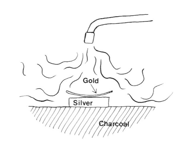 - Fusing is done on a flat charcoal block with at least 2.0mm of charcoal on each side of the blank. As the charcoal burns it uses up oxygen and helps maintain a reducing atmosphere. The gold sheet is placed on the silver (clean sides in contact). A very soft, gas-rich flame is used, which envelopes the metal and charcoal. This flame is maintained and the temperature is slowly raised until the silver begins to near its melting point. If one is using gold pressed over silver, care must be exercised at this point as the silver surface is mostly hidden from view and the silver alloy may unexpectedly appear through the gold. If you have placed the gold sheet on the silver it may be advantageous to have it domed slightly so that the centers of the sheets contact each other. If a reducing atmosphere has been maintained, the centers fuse first and the fused area moves outwards to the edges. This technique helps eliminate air bubbles trapped under the gold. The moment that fusing has taken place, heating should stop.