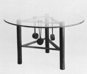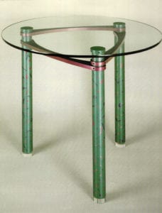 The metal furniture, however, that has been emerging from the studios of contemporary metalsmiths, has a different set of concerns. Consider the aluminum tubing used by metalsmith Peter Handler for the legs of a collection of tables. Handler addresses both substance and surface of his material. While the anodized aluminum legs rest solidly on the ground, a calligraphy of shapes and gestures floats on their surfaces, conveying a slightly contradictory lightness. Likewise, other strips of aluminum appear to float and wrap around the legs, attaching them. The play with weight and weightlessness, by nature of the material, is more in the metalsmith's domain than in the woodworker's or ceramist's, and it is one keenly appreciated in Handler's work. Coupled with his attentiveness to surface decoration, the tables are a significant departure from conventional uses of metal tubing.