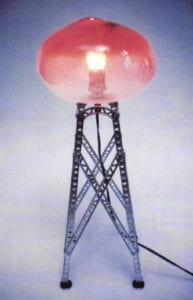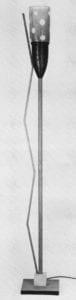 Louis Mueller, came to his design of lamps by a similar, though less direct route. Originally a silversmith, Mueller turned to sculpture in the mid-70s in an effort to move from "a recognizable subject to a more personal, conceptual understanding of forms involved." When, in 1981, he designed and constructed two lamps in brass, silver-soldered, with blown glass shades for his own use, he returned to the design of the utilitarian object.