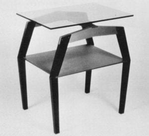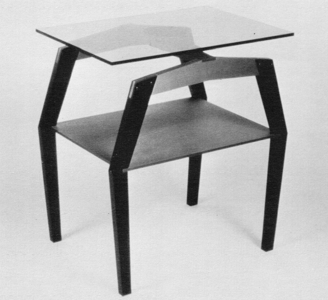 Like Jackson, Karl Bungerz works in a variety of different materials. His tendency, however is to combine them in a single piece. The Conversation table, constructed of hollow welded steel and bird's eye maple, juxtaposes color, material, surface texture. Yet their precise fit belittles these differences, stressing instead the compatibility not only of materials but also of craft mediums. That woodworking and metalsmithing can dovetail so gracefully is a lesson valuable to practitioners of both.