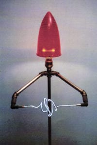 As a metals student of Mueller at Rhode Island School of Design, Todd Noe has also turned to lamps, but for more pragmatic reasons. "People liked the slick, lacquered finishes on my pieces," he explains, "but nobody bought the sculpture, so I tried to think of something else I could do applying the same esthetic." Because finish and color are Noe's focus, he uses metals that can be easily painted; colored brass and copper stalk support the fan of the shade in a play with form that is nurtured by the sculpture. Like Mueller Noe turns to lamps as a design exercise that further develops the innovations found in the sculpture.