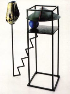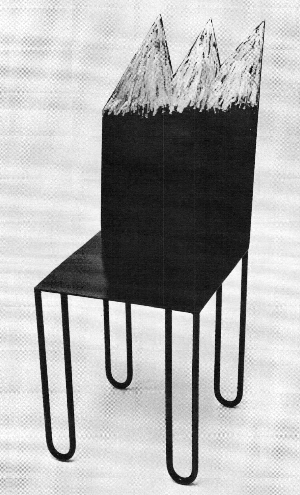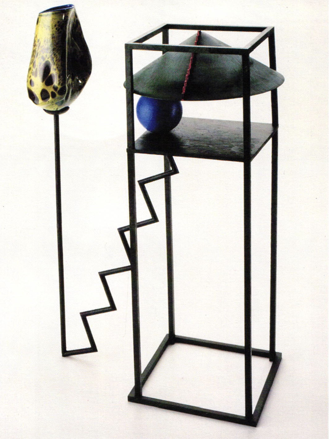 Before designing furniture, Meister studied music, still photography, the Classics. And when he turned to furniture design, he explains, he simply started designing backwards. "I decided what it was going to look like first. Then I decided what materials it should be constructed in. The important thing to me was how it looked, the poetry of it." Meister's steel pieces are constructed with the most basic cutting and welding techniques, and perhaps for this reason—though he does do the work himself—he does not consider himself a craftsman. The pieces lack the detail in construction that is so evident in most pieces made by trained metalsmiths; they are not finely crafted, nor do they pretend to be. Yet they make the same inquiries into a contemporary esthetic as Handler's pieces; and though the answers they find are radically different, they too "speak for their own time."
