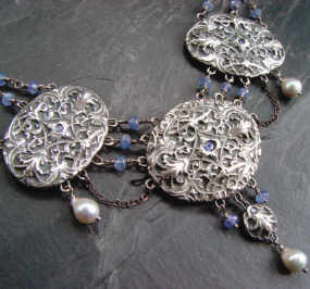| Shahasp routinely photographs her new work and sends photos to editors for consideration. This is some of her newest work, Victorian Ballgown Necklace. |