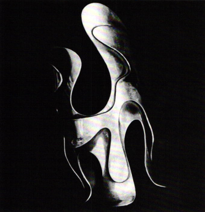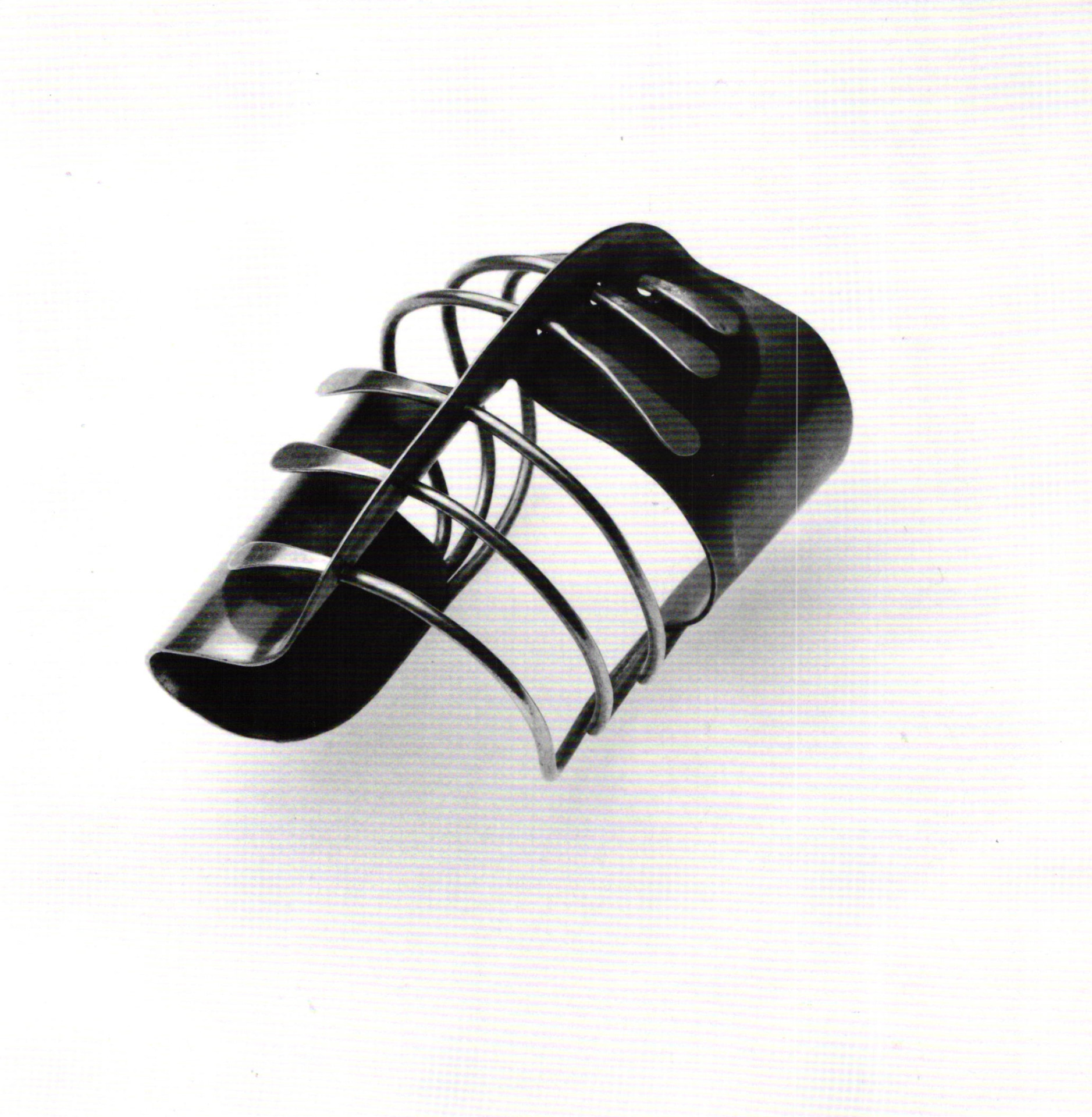 Biometric forms, as seen in the painting and sculpture of the Surrealists were appropriated and reinterpreted in the metal imagery of Art Smith. The huge silver cuff bracelet comprised of two undulating masses superimposed one upon the other, brings to mind the amorphous shapes used by Miró and Arp. The duet of forms seems to slither amoebalike around each other, attached securely at some points, while at others the upper mass strains to free itself. The whole projects the characteristics of some primeval entity. Imagining the bracelet on a wrist, the ends would curve away from the human element, negotiating its protoplasmic "escape." The areas where the silver is curved most deeply contain dramatic negatives spaces—to be filled in by a forearm; air replaced by skin—always a strong element in Smith's design. "Things should really play with each other and they should play with the body. It should be fun, it should be an exploitation. It should be an investigation. A good piece of jewelry literally caresses the body and fondles it and as I say, plays with it . . . it enjoys itself and it enjoys you and you enjoy it."7