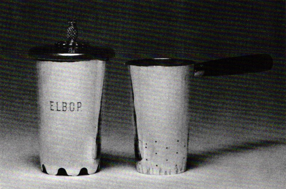 The infuser in the institute's collection is marker "P" as well as "F. Porter" and "STERLING." It bears a presentation engraving "ELBCP." The engraving was probably not done by Porter.