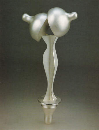 Gold, in fact, however delicate a material in pure form, is an ancient symbol of eternal life, by reason of its association with the sun. Metalsmith art toys are also much more immediately magical, by reason of the fact that they are "participant objects." They are meant to be used-even if one may have to shake an art rattle in secret, so that one doesn't feel ridiculous. We thus get more directly involved in them than if they were simply presented for our abstract edification and contemplation, like official high art. Metalsmith art toys remind us of the secret purpose of art: to take us back to the imaginary happiness of childhood, in whatever sublimated form, so that we can once again feel unequivocally and uninhibitedly alive - once again believe that life is fun rather than a joke the gods have played on us.