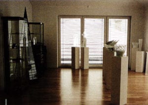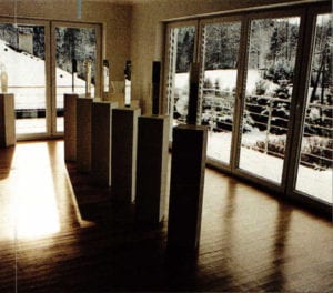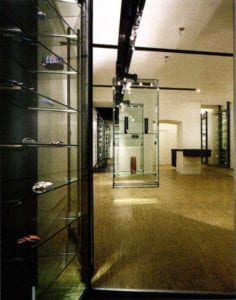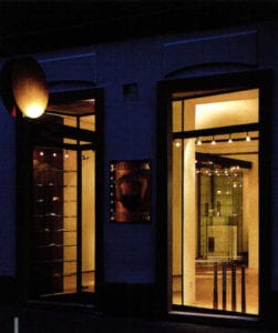 The fashioning of a new Viennese jewelry gallery was taken as an opportunity to realise a completely new architectural construction for jewelry presentation. Thus the Gallery Slavik can be seen as a pilot project in a certain sense. As everywhere there is naturally also the danger in the design and construction of jewelry stores and jewelry galleries of becoming trapped in the schematic-conventional. New, actually revolutionary paths were entered by the architect. The task was, to design a gallery in a landmark-protected house in Himmelpfortgasse 17, in the centre of Vienna. There were three differently sized rooms in the historical building. They were connected by large, fixed elements, two long, straight wall boards and a steel rail. These elements take on different functions. The steel rail, as the longest element, just cuts through the opening door onto the street and supports a bronze disk, which appears to roll on it. Slideable and slewable glass showcases are hanging from the rail. The rail also carries the variable lightning. None of the fixtures touch the floor, not even the expandable showcase table, which connects two rooms. Should the street-side part of the gallery have to be kept free for some occasion, all of the showcases can be pushed along the rail and the wall boards to the back part of the gallery, just like in a train-station.