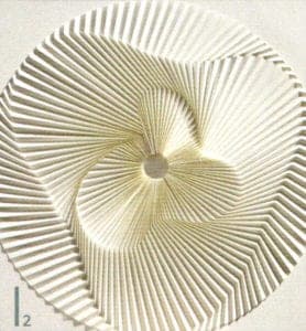 Japanese designer Nishimura Yuko has also been awarded notable prizes for her innovative paper reliefs while still a student of architectural design at Tokyo's Nihon University. Using her skilled fingers as her tools, she transforms crisp, single white sheets of Japanese hand-made paper into two dimensional panels and three dimensional objects that are filled with rhythmic patterns comparable to music. Even the most subtle play of light across these complex folded surfaces endows them with an unusual energy and excites the senses. Walter Chen, a Barcelona-based goldsmith with Asian roots, also works with paper.