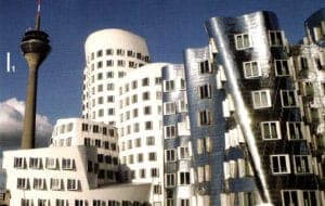 The 'Neuer Zollhot' buildings have been designed by Frank O. Gehry to look folded and crumpled and have become a real landmark of Düsseldorf