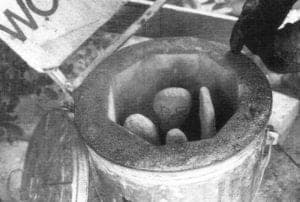 Firing is perhaps the most enjoyable part of Ashante casting. The entire process depends upon one's ability to "read the fire." Subtle changes in the color of the flame, coals and smoke are indicators of temperature changes within the kiln. The fuel must be a hardwood charcoal such as oak, maple or mesquite. Hardwood charcoals yield a slow-burning fire, producing an oxygen-depleted environment within the kiln. Firing can take from 20 minutes to 2 hours, depending upon the size of the pieces to be cast. To begin firing, the kiln is partially filled with charcoal and the flasks are placed crucible side down. After preheating for 15 minutes, small pieces of charcoal are rightly packed around the flasks, filling the kiln. The heat in the kiln is gradually brought up until a yellow-orange flame appears, the result of wax residue in the flasks burning off. An air source, either foot bellows or hair dryer, may be used until the coals at the top of the kiln are glowing. Periodically, the charcoal is tamped down and new charcoal added to the top of the kiln.