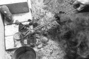 When the brass begins to melt, greenish-yellow flames are produced and a whitish-yellow condensation forms on top of the coals. Both of these indicate that toxic zinc fumes are being released. After the yellow-green flames subside, a white zinc smoke is produced, indicating that the flasks are ready to cast. The flasks are pulled from the kiln, drilled to release gas, and inverted to allow the molten metal to flow into the wax casting. The hot flasks are set aside for about 5 minutes until the metal solidifies. They are then quenched in water and cracked open to reveal the finished castings.