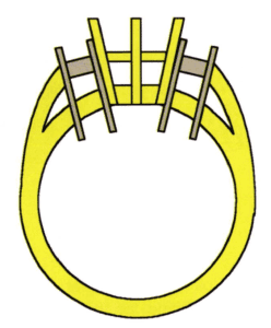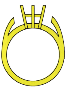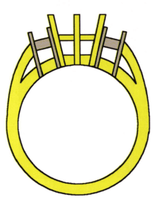 First, adjust the center crown to fit the center stone as necessary. Then, solder it to the shank using yellow gold medium solder. Make certain the distance between the side of the crown and the top edge of the shank is equal to the width of the side crowns. You may need to add a piece of sizing stock between the shank and crown with some shank styles. Solder the sizing stock to the shank with yellow gold hard solder, clean up the shank and polish. Then, attach the crown.