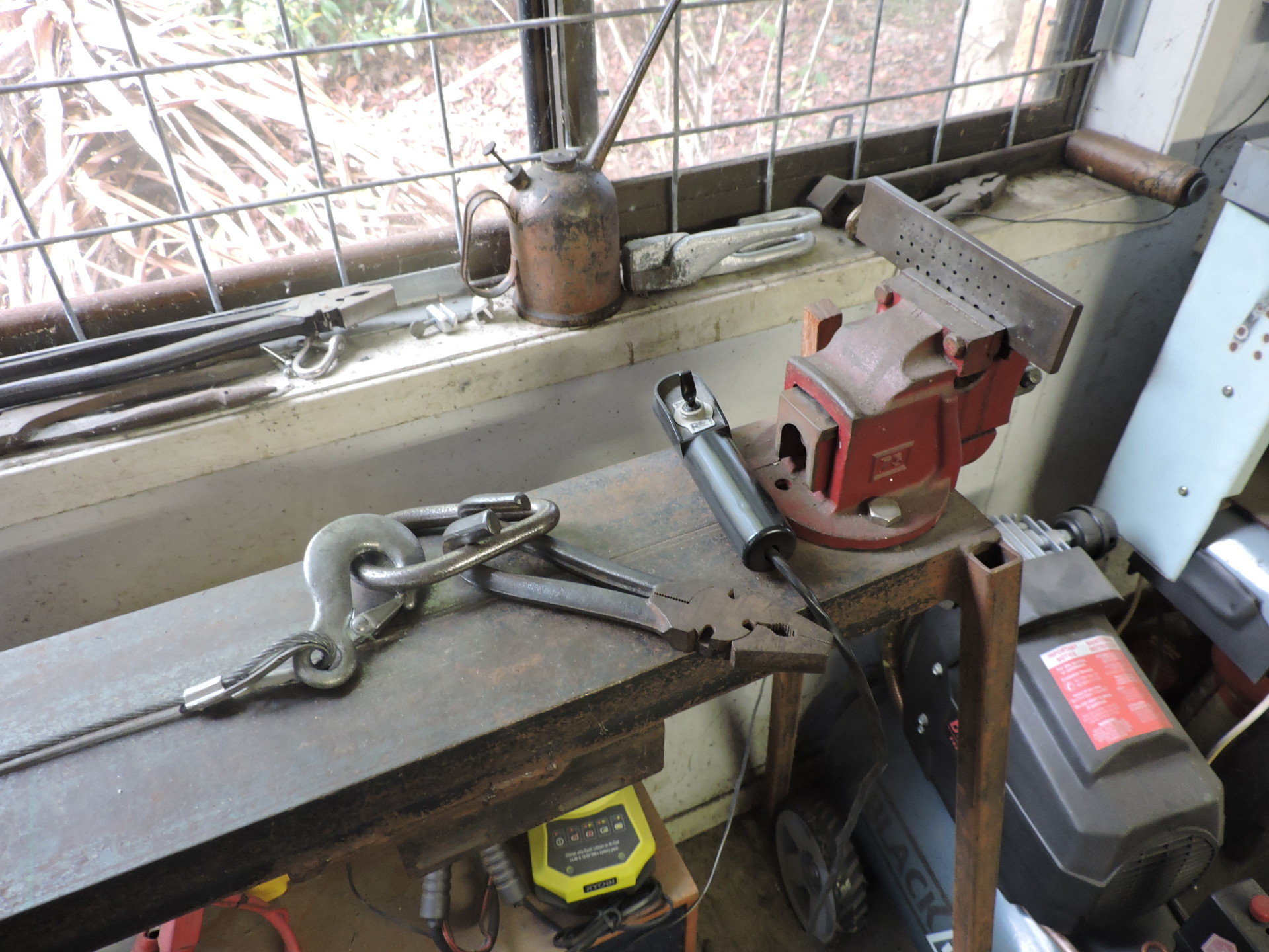 Sel and Lorraine Pilgrim have a shop in Surfer's Paradise on the Gold Coast that is full of similar innovation. The drawbench for making wire and tube is homemade, with a vise to hold the draw plates and an altered pair of pliers that grip the wire end better than standard draw tongs. Some of the alterations they made to the pliers include smoothing off the teeth in the jaws so they grip better and do not damage the wire point to be drawn. The handles of the pliers have also been heated and bent back so that they can hook into a large steel ring that is attached to the 3/8-inch steel drawing cable. The bent handles automatically tighten the plier jaws onto the wire when using the drawbench. An electric boat winch powers the drawbench. To operate it, a wire is placed in the drawplate, the pliers clamped onto the protruding wire tip, and the switch for the boat winch is used to start drawing. The cable winds up into the housing of the boat winch.