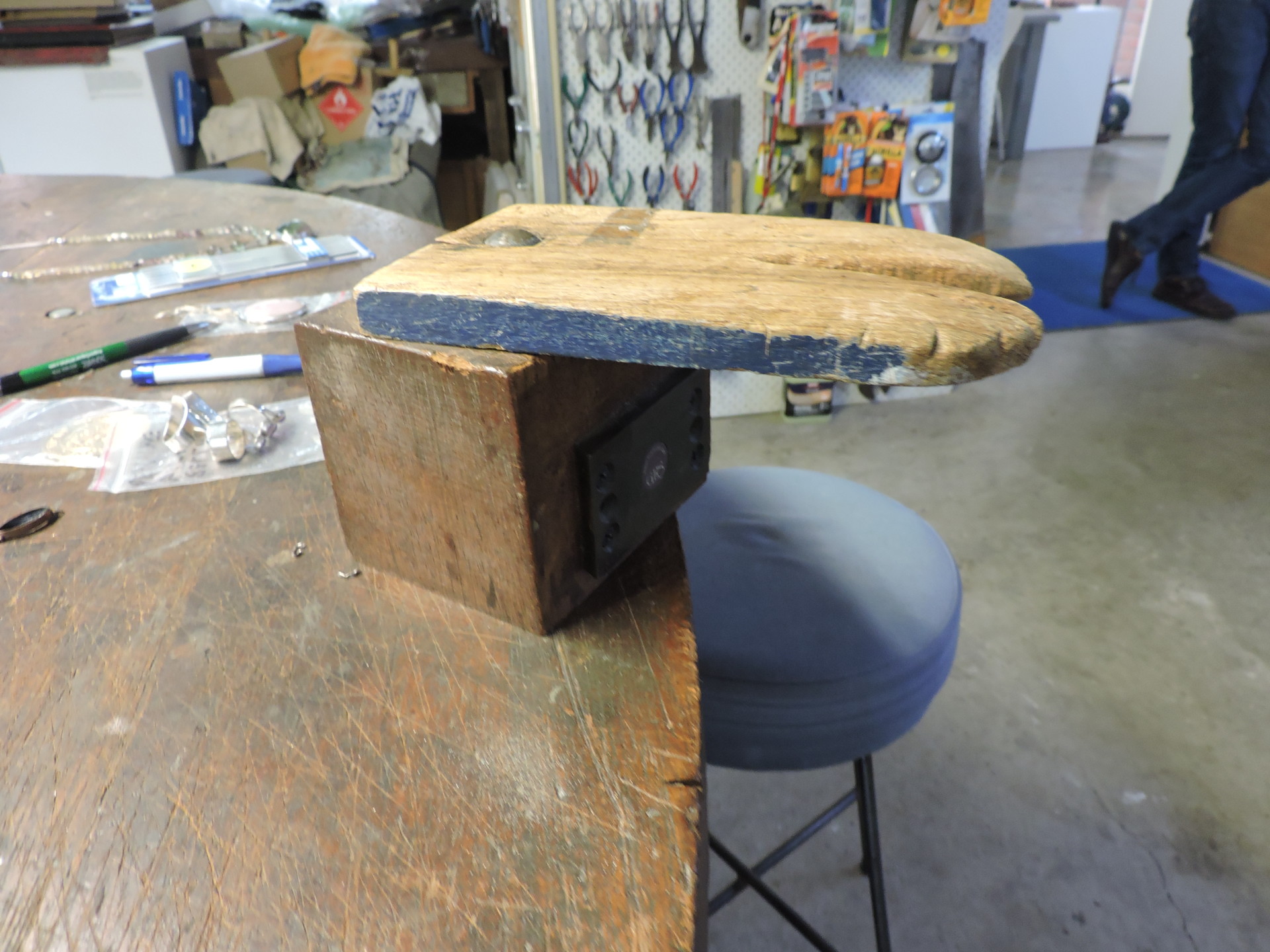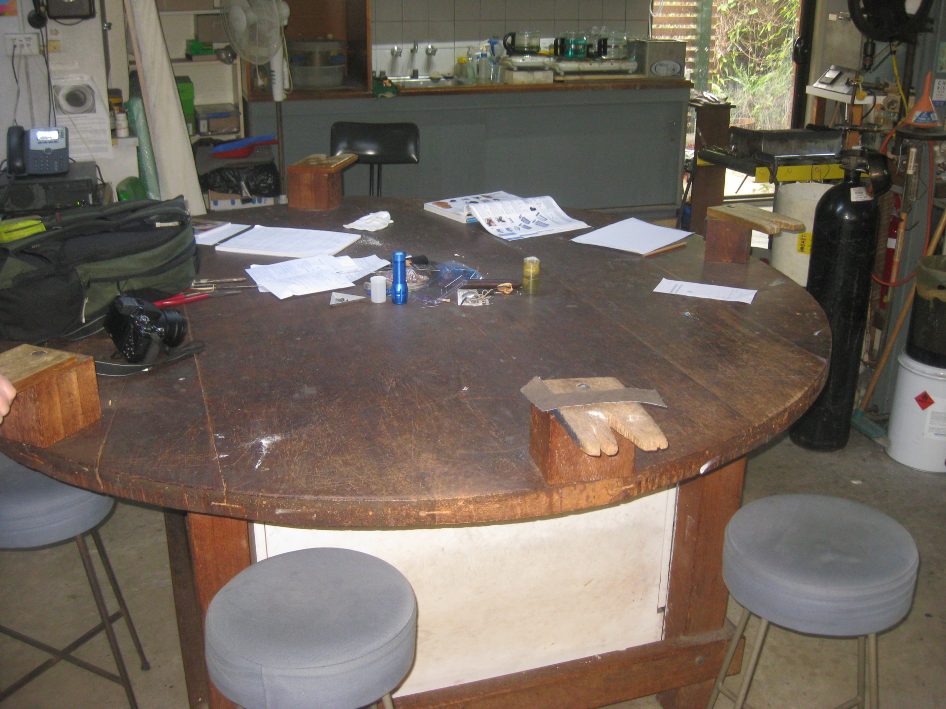 They also have a round worktable at the shop that allows different tasks to be done at each of the table's four bench pin stations. The bench pins are raised to the correct working height. When not in use for making jewelry, this table also permits the teaching that Sel has done once a week for years.