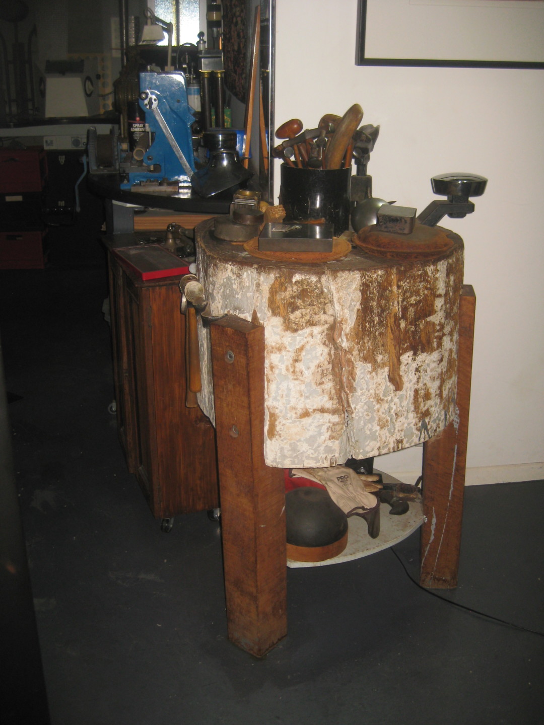 Something else I saw were different versions of tool islands, which do not take up much room in a studio and create a great small working surface. Tool islands usually offer different heights than a bench, are more stable for hammering and punching operations, and are often used for tasks done while standing. They can also provide additional storage space, which is always at a premium in a jewelry workshop. A great one I spotted was made by Barbara Heath in Brisbane. She constructed it using a very heavy Australian wood that is many times harder than most North American woods, which adds to its stability and ability to last longer for metal shaping. She and her goldsmith use the island for flattening, hammering, stamping, and shaping metal on stakes that she can mount on it.