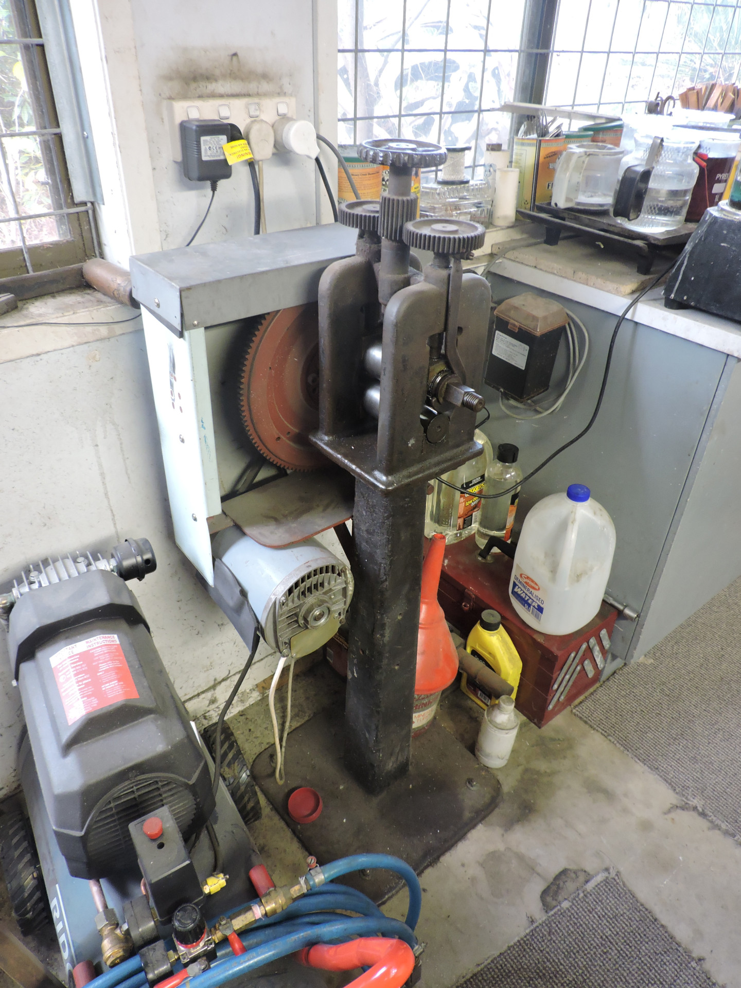Sel has converted a hand rolling mill into a powered version using automobile transmission gears and a belt and pulley system in order not to have trouble with the gears under strain. This saved him a lot of money, as a powered mill in Australia would have been 10 times more expensive than his converted hand operated mill. His powered mill saves his shop much in time and labor costs.