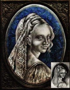 Lisel Salzer. I'm indebted to a transcription of a videotape explaining her grisaille method; it gave me a place to start in learning enamel painting. I found this on the internet, along with pictures of her work, and was impressed with both her lovely technique and with the diligent effort she had made to develop and perfect it. She explained in good detail, so I was able to try her method and modify it somewhat to suit my own style.