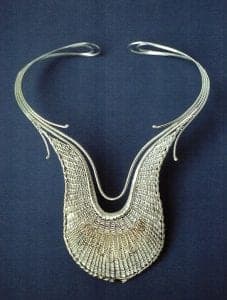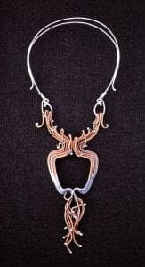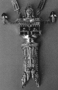 The first American works to be shown at Electrum were pieces by Ed Samuels and Omar K. Bone, which were included in Erotic Jewellery in 1971, the second exhibition ever held there. In 1976 there was an exhibition entitled 6 American Jewellers which included Eleanor Moty, Arline Fisch, Mary Lee Hu, Richard Mawdsley, and Hiroko and Gene Pijanowski. This transatlantic relationship has continued through the years and most prominent American jewellers have shown there, the latest being Arline Fisch and Stanley Lechtzin in the 25th Anniversary show. Wishing to tease out some feelings about American work vis-à-vis European work, I asked her about the two and if she agreed with my contention that one could invariably identify the two sensibilities even when viewing unidentified slides.