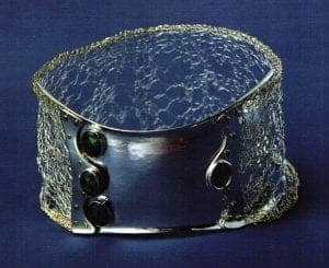 For owner/director Cartlidge, Electrum's 25th Anniversary in June of 1996 was another milestone in her lifelong association with jewellery. Her initial encounters with the medium were in the 1930s when she made her first bracelets, ashtrays, and bookends in school in Germany. But, as the odious clouds of Nazism descended over the country, she was forced to fee to England where she took up residence in 1938. During the War she took a succession of secretarial jobs, 22 in one year alone, from which she says she learned much about how and how not to run a business.
