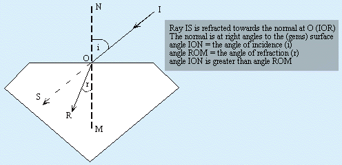 A ray light entering an optically denser medium is bent (refracted) towards the normal. The greater the bending (refraction) for a given angle of incidence the greater is the refractive power of the stone.