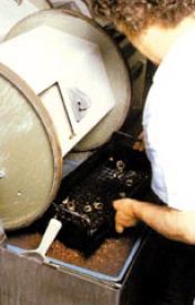| Figure 1 Barrel finishing. The operator is separating parts from media after the cutting cycle. |