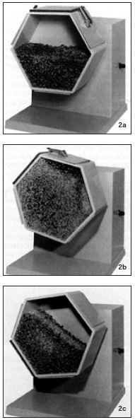 Figures 2a-c show how the speed of rotation (barrel speed) determines the way in which parts and media are caused to move in the barrel. For the purpose of illustrating this effect, the barrel in the photographs was half- filled with simulated media and parts (Figure 2a). This represents a filling ratio of 50 percent, which should be the minimum load to be used in practice. In Figure 2b, the barrel is rotating too fast, and its contents are being swept upwards only to fall back against the parts below. At such barrel speeds, the parts are not being cut down or burnished by the media, but are in danger of being severely damaged through colliding with one another. This phenomenon is known as impingement.