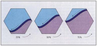 | Figure 5 Diagrams showing that the length of the slide zone in a rotating hexagonal barrel remains constant for filling ratios between 25% and 75%. |