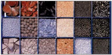 | Figure 6 A selection of media used in barrel finishing processes. Top left: plastic cones; Bottom left: ceramic chips; Centre: wood media; Right: steel balls, balcones and pins. |