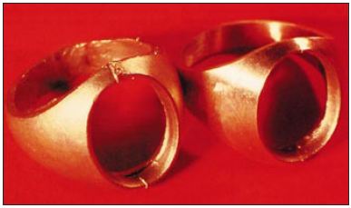 | Figure 8 Before and after This photograph of two gold rings gives a good indication of what can be accomplished with modern tumbling processes. |